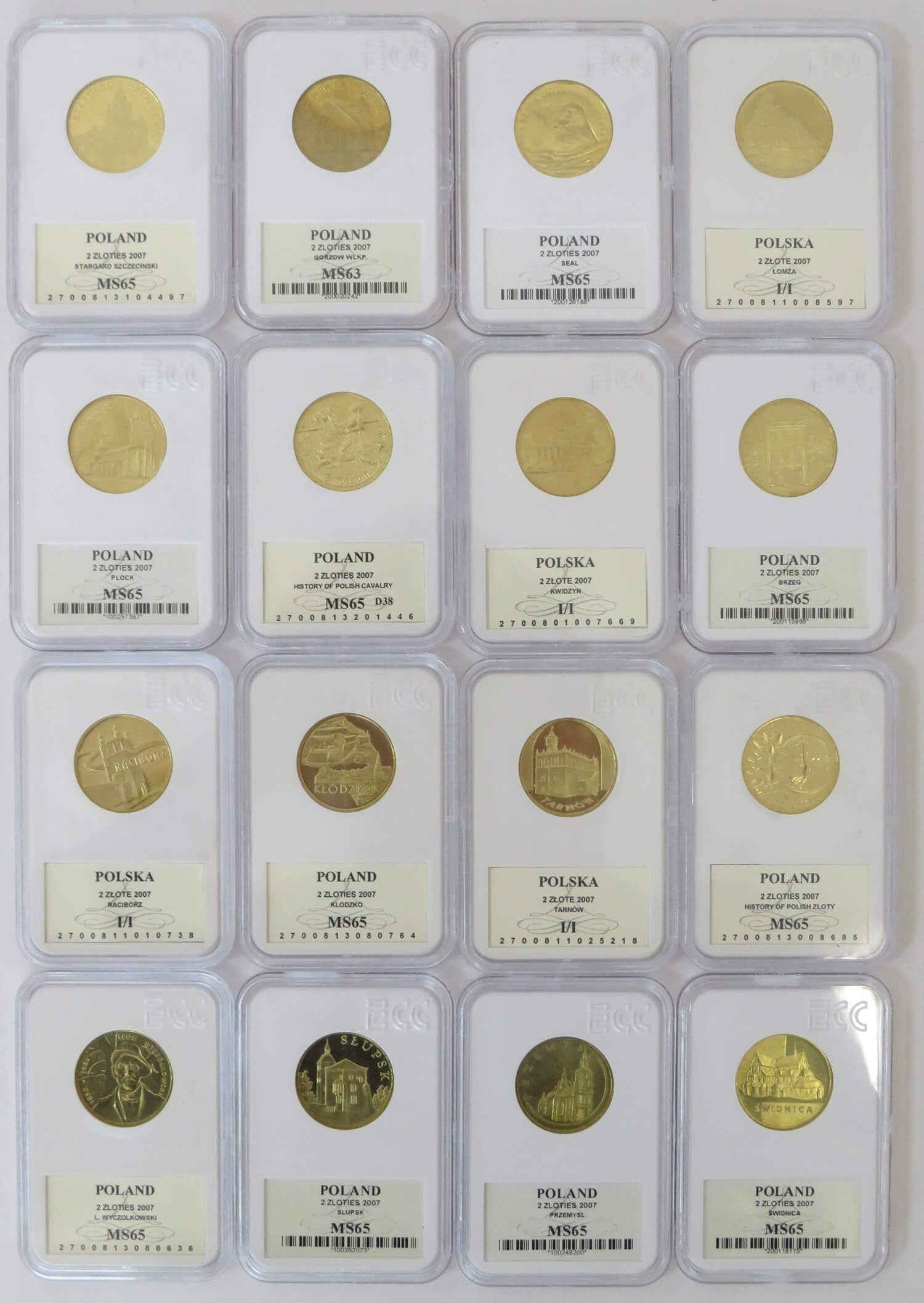 Zestaw 16 monet 2 zł GN rocznik 2007, grading GCN MS63-MS65/MSI/I, mennicze
